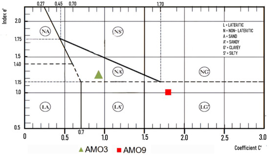 The soils studied were classified as NA’ and LG’ according to the MCT classification, as shown in Figure 7. The modified Proctor compaction test revealed similar values of dry unit weight (MEAS) for samples AM03 and AM09, recording 2.048 g/cm3 and 2.043 g/cm3, respectively. The Atterberg limits of the samples indicated a plasticity index (PI) of 7.2% for AM03 and 5.02% for AM09, characterizing both materials as having low plasticity. According to the MCT classification (DNIT 259 [39]), soils with low plasticity tend to exhibit better compaction characteristics and greater volumetric stability. The particle size analysis showed that both samples have a predominance of fine sand, which directly affects their mechanical behavior under cyclic loading.
