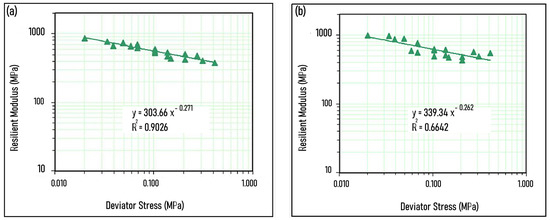 The results were processed using the Systrain 2.0 software (MRCalc tool), which provided the model parameters and correlation coefficients (R2). Among the evaluated models, the composite model proposed by Pezo [44] was adopted, as it is widely used for pavement design in Brazil.