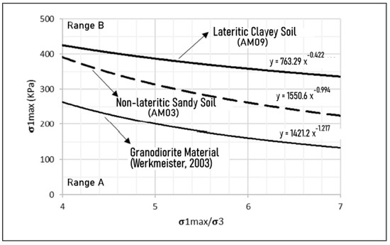 AM03 exhibited a greater variation in the shakedown limit compared to AM09. This behavior may be associated with the lateritic characteristics of the LG’ soil (AM09), including the presence of aluminum hydroxides, which promote natural cementation and influence suction stresses. Although AM09 showed less sensitivity to moisture variation than AM03, both demonstrated a significant influence of this factor, as evidenced by the shakedown curves obtained according to the methodology of Werkmeister [50] and the EN 13286-7 standard [49].