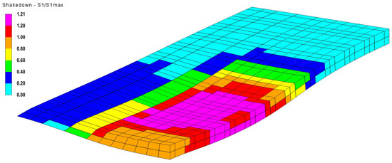 In contrast, in Scenario 2 (Figure 14), a more pronounced increase is observed in regions where exceeds 1.0, indicating a higher critical stress state compared to the previous condition. This behavior suggests that, under such circumstances, the soil becomes more vulnerable to progressive failure, potentially compromising the long-term structural stability of the railway pavement.