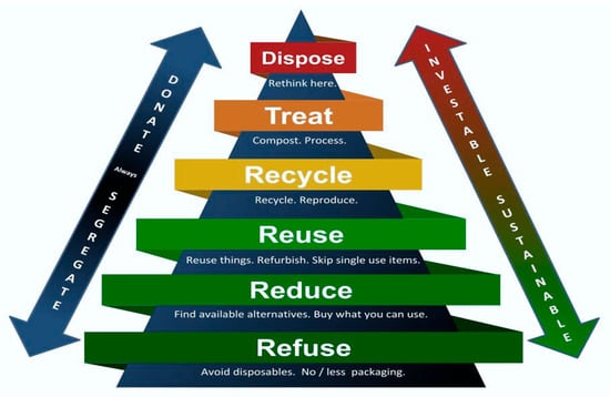 - Kazerooni, M.A.; Abdullah, A.; Navazandeh, M.S.; Kamal, M.B.; Torshizi, F.; Taherkhani, R. Reduce, Reuse, Recycle and Recovery in Sustainable Waste Management. J. Adv. Mater. Res. 2012, 446–449, 937–944. [Google Scholar] [CrossRef]