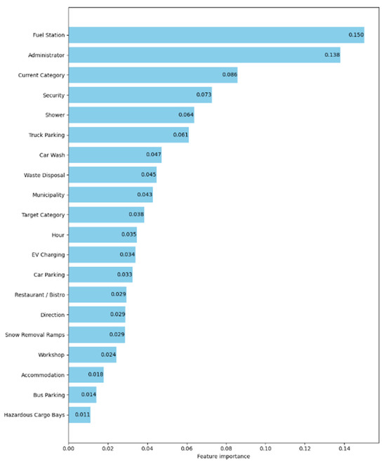 - Zheng, Y.; Cheng, C.; Yu, S.; Ye, X.; Li, X.; Wang, Z. Predicting the vehicle turn-in rates of highway service area: A random forest approach. In Proceedings of the 2023 IEEE 26th International Conference on Intelligent Transportation Systems (ITSC), Bilbao, Spain, 24–28 September 2023; pp. 1349–1354. [Google Scholar]
