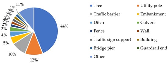When considering the objects that vehicles most often hit, according to statistics, these are trees (44%), utility poles (12%), and guardrails (10%), as shown in Figure 1 [].