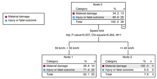 The resulting classification tree, shown in Figure 2, included only one predictor, producing a significant split (adjusted p = 0.037, χ2 = 6.264, df = 1). The first node (Node 0) contained all 38 cases, with 34.2% involving only material damage and 65.8% resulting in injury or fatal outcomes. The tree was then split into two terminal nodes based on the speed limit group. Crashes that occurred at or below 40 km/h (Node 2) were exclusively material damage crashes (100%), while crashes at 50 km/h or higher (Node 1) were associated with more severe outcomes—only 28.6% resulted in material damage, and the remaining 71.4% led to injury or death. These results provide evidence for prioritizing the application of passive safe infrastructure on roads where the speed limit exceeds 40 km/h.