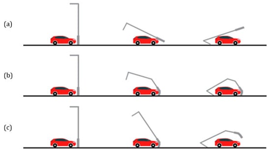 Non-energy absorbing (NE) poles remain rigid during impact and typically shear near the base, separating from the foundation and falling behind the vehicle (Figure 3a). Their primary advantage is allowing the vehicle to move post-impact, reducing damage and passenger injury. However, this behavior risks secondary crashes due to the falling pole or the vehicle’s continued motion. NE poles are thus recommended for high-speed rural roads with minimal roadside hazards or vulnerable road users. However, they are unsuitable for urban areas where secondary collisions pose a greater risk []. High energy absorbing (HE) poles plastically deform upon impact, bending around the front and underside of the vehicle while remaining anchored to the foundation (Figure 3b). This progressive deformation significantly reduces vehicle speed, lowering the risk of secondary collisions with roadside objects or other road users. While HE poles may result in higher forces transmitted to vehicle occupants, especially at higher speeds, these injuries are generally less severe than those resulting from crashes with conventional rigid poles. HE poles best suit low-speed areas with high pedestrian activity or complex roadside environments. Low energy absorbing (LE) poles exhibit characteristics of both NE and HE poles. They deform around the vehicle similarly to HE poles but detach from the foundation like NE poles (Figure 3c). This allows for moderate deceleration and reduced vehicle damage. LE poles are considered appropriate for a wide range of road environments, including urban roads and areas with moderate speed limits, where a balance between vehicle occupant protection and risk to other road users is needed.