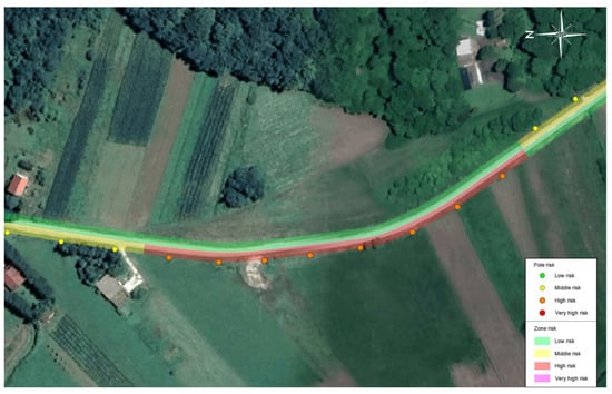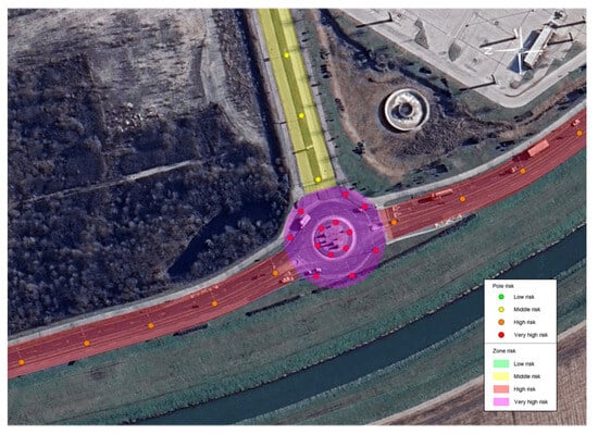 “Pole risk” refers to the risk associated with a particular pole location (based on its environment), while “zone risk” reflects the cumulative risk of a roadway section containing one or more such poles. Based on the available data, risk zones were categorized as low, medium, high, and very high risk. The classification aspired to prioritize intervention and propose locations where passively safe poles or other measures would be most effective. Figure 4 and Figure 5 present representative examples of defined pole crash risk zones.