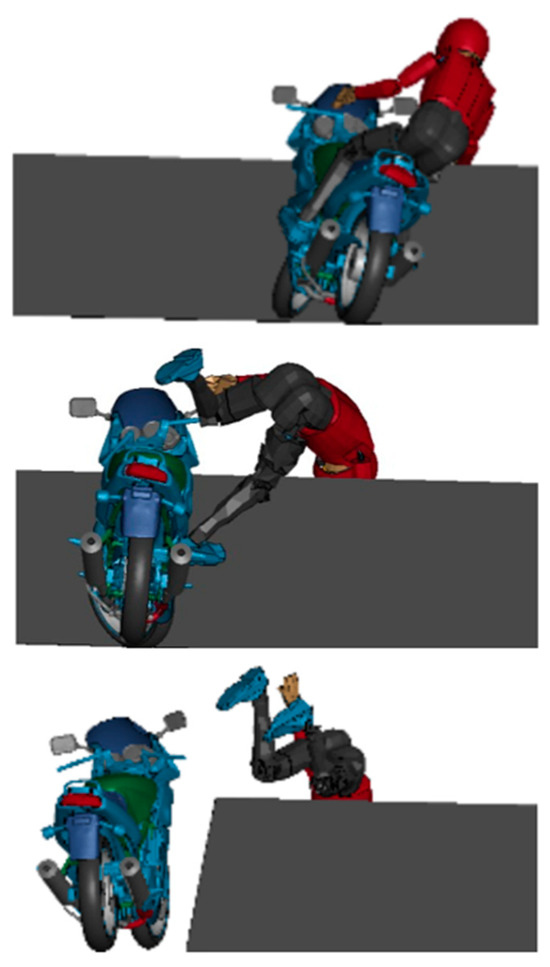 In such a case, due to inertia, the upper part of the motorcyclist’s body bends over the upper sharp edge of the SSB guardrail (Figure 1). Which part of the motorcyclist’s body bends over the upper edge of the SSB guardrail depends on the height of both the motorcycle and the motorcyclist. As a rule, the motorcyclist’s body bends over the lower ribs or internal organs, where injuries are most dangerous. In addition, motorcyclists’ heads are protected by a helmet; their hands by gloves; and their shoulders, elbows, and knees by protectors, but the ribs and internal organs have no protection.