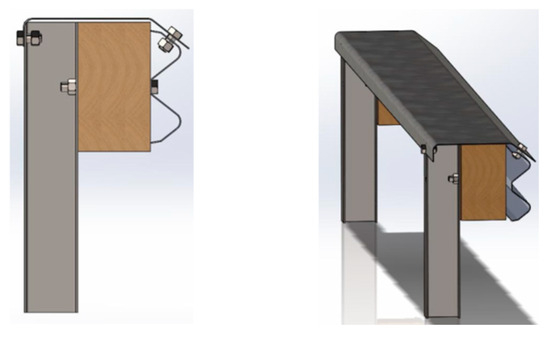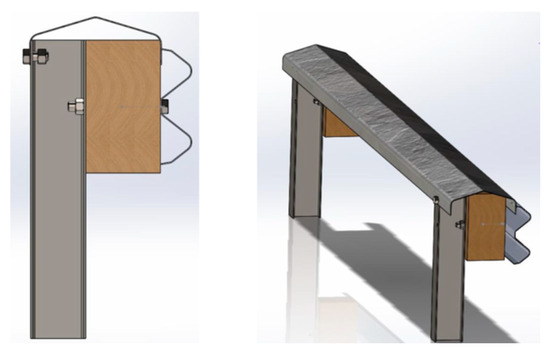 The element (darker one) is installed on the guardrail of the existing SSB, as shown in Figure 11. The lower part of the protective element matches the shape of the guardrail profile, while the upper bevelled part is attached using screws, similarly to how standard SSB rails are connected. This installation method ensures compatibility with existing systems and ease of retrofitting.