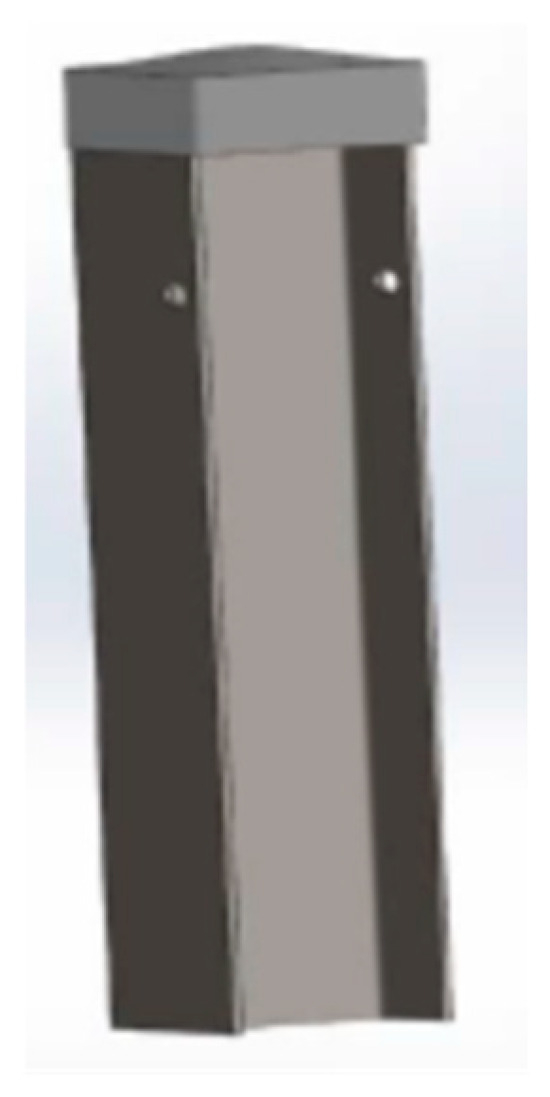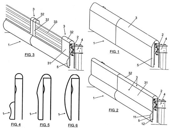 Patent WO2020058935A1 [19]—named ‘guardrail protection device’ (Figure 8)—is one of the few solutions that solves the problem of hitting the upper edge of an SSB post. This protection device comprises a longitudinal barrier with an outer surface facing a lane that is delimited at the top and the bottom by flaps, a supporting element that can be anchored to the ground and connected to the barrier on the opposite side of the outer surface, and a protective body connecting with the barrier to cover at least one portion of the barrier. The guardrail cover is made of a polymer material (expanded polyurethane).