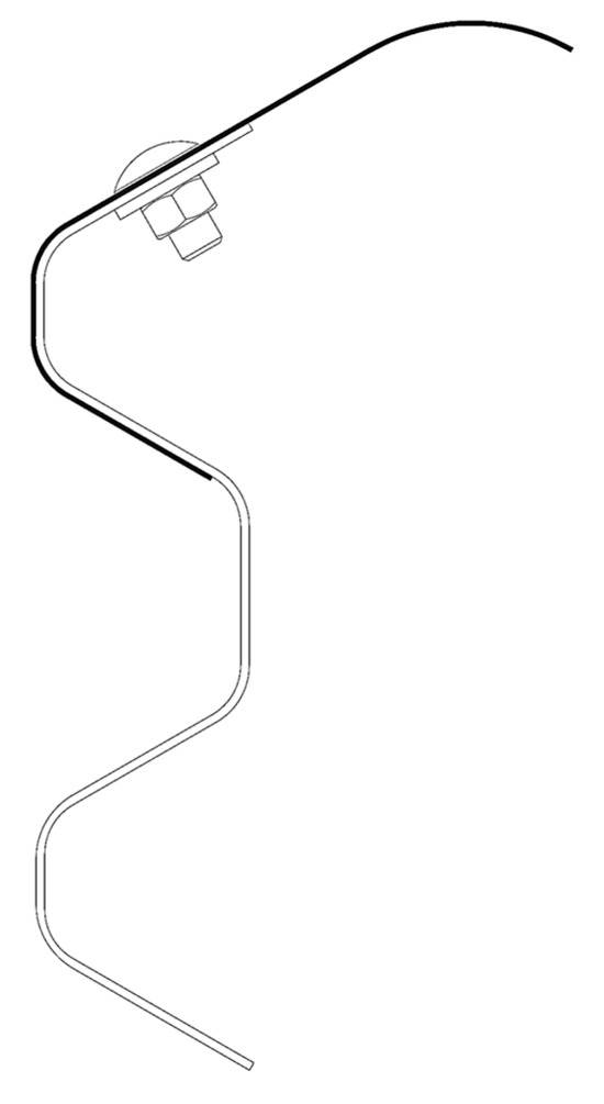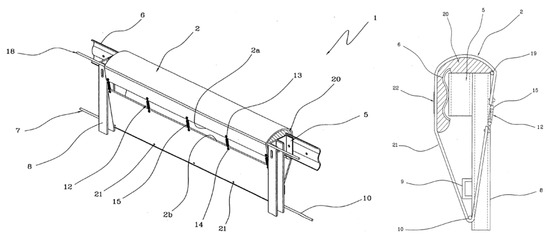 Patent EP1484448A2 [21]—named ‘cover element for motorway barriers or guardrails’ (Figure 10)—is another solution that solves the problem of hitting the upper edge of an SSB post. This cover element for motorway barriers or guardrails comprises a first portion (located on the front part of a guardrail, having a height sufficient to cover the front part of the guardrail), a second portion (located above the upper part of the guardrail and having a width sufficient to cover at least the entire width of the upper part of the guardrail), and a means for affixing the cover element in position relative to the guardrail.