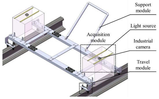 Chongqing Metro is selected as the primary line for rail damage data acquisition in this study. A self-developed detection device is employed for image acquisition, which mainly consists of a support module, a travel module, and an acquisition module, as illustrated in Figure 1 []. First, the support module, constructed from a lightweight aluminum alloy, serves as the backbone of the entire rail damage detection device. It is designed to mount the components of both the travel module and the acquisition module. Second, the travel module comprises travel wheels that run on the rail surface and guide wheels that clamp onto either side of the rail waist. These components are responsible for the movement and guidance of the entire rail damage detection device, enabling it to operate at a speed of 2.5 km/h. The clamping wheels are spring-loaded to ensure adaptability to variations in the actual track gauge. Additionally, the acquisition module constitutes the core of the rail damage detection system, featuring an adjustable light source and an industrial camera. The light source is positioned on both sides of the acquisition box to stabilize illumination, while the industrial camera is mounted above the rail surface to capture images of rail damage.