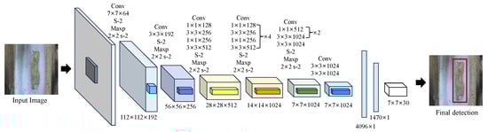 The YOLO model is a single-stage object detection framework. Its core idea is to frame the object detection task as a unified regression problem, enabling end-to-end mapping from image pixels to bounding box coordinates and category probabilities [,,]. The detection workflow of the YOLO model is illustrated in Figure 3 []. Initially, the input rail damage image is partitioned into an S × S grid structure. Each grid cell simultaneously predicts the location, confidence score, and categorical probability of potential rail damage bounding boxes []. Subsequently, the model predicts the targets and probabilities for each possible damage category within the grid and applies non-maximum suppression to eliminate redundant bounding boxes. Ultimately, the precise bounding boxes for various rail damage detection targets are generated as output []. In this study, the YOLOv8 model is primarily selected due to its superior detection efficiency and real-time performance.