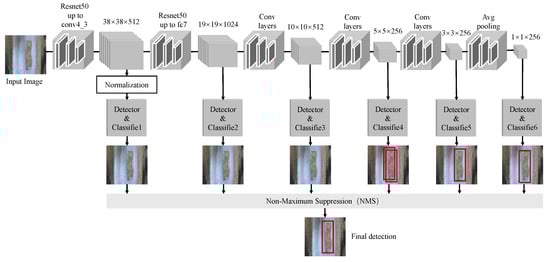 The Single Shot MultiBox Detector (SSD) is a convolutional neural network designed for fast and accurate object detection. The architecture of the network is illustrated in Figure 4 []. The process begins with the input image depicting rail damage, which serves as the foundation for the entire detection procedure. Initially, ResNet50 is employed as part of the backbone network to extract damage features up to the conv4_3 layer and prior to the fc7 layer. Following the backbone network, feature extraction continues through a sequence of convolutional layers, yielding damage feature maps with dimensions of 10 × 10 × 512, 5 × 5 × 256, 3 × 3 × 256, and 1 × 1 × 256 after average pooling. These feature maps at different scales capture information at various levels within the damage image; smaller-sized maps possess stronger semantic information, while larger-sized maps retain more detailed information. Subsequently, the Detector and Classifier modules (Classifier1–Classifier6) is connected following each distinct scale of damage signatures. These modules are responsible for detecting and classifying rail damage on the corresponding scale’s feature map. Finally, the outputs from each detection and classification module are aggregated and forwarded to the non-maximum suppression module (NMS), where the bounding box with the highest confidence score is retained, resulting in the final precise rail damage detection results.