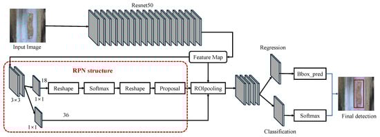 Faster R-CNN is a representative multi-stage object detection model. Its core idea is to achieve end-to-end object detection via the Region Proposal Network (RPN). The detection pipeline of the Faster R-CNN model is illustrated in Figure 5 []. First, ResNet-50 serves as the backbone network to extract feature maps from the input rail damage images. Then, the RPN generates region proposals and uses a softmax classifier to determine whether each anchor contains a rail damage target, along with predicting bounding box coordinates. Subsequently, high-quality candidate regions are generated by regressing the anchor positions for more accurate localization. Next, the candidate regions of varying sizes are transformed into fixed-size feature maps through region-of-interest (RoI) pooling, preserving spatial information for further processing. Finally, precise rail damage detection results are obtained by classifying and refining the candidate regions using fully connected layers, which output the exact bounding box positions.