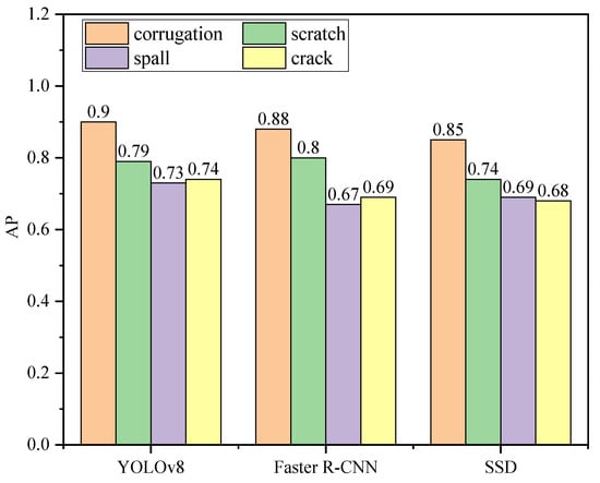 In the evaluation of the detection accuracy, the AP and the mAP are measured, which comprehensively consider the detection performance of the target detection model across all categories. The AP is the detection accuracy comparison of each rail damage category. The mAP is the average value of the AP values of all categories. In both cases, the higher the value, the higher the detection accuracy.