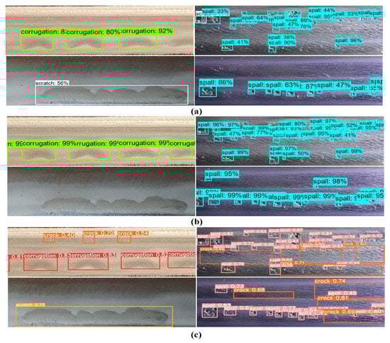 In addition, to more intuitively demonstrate the detection performance of different target detection models on four typical types of rail damages, the application effects of rail damage target detection are presented in Figure 7. Specifically, the detection results for the four types of rail damage using the SSD model are shown in Figure 7a. The detection results for the same damage types using the Faster R-CNN model are illustrated in Figure 7b, and those using the YOLO model are depicted in Figure 7c. Observations reveal that the SSD model exhibits some missed detections when identifying rail corrugations. The Faster R-CNN model demonstrates the highest accuracy for rail corrugation detection at 99%, while the YOLO model also achieves highly accurate results for this type of damage. Regarding rail scratch detection, the SSD model achieves an accuracy of 56%, whereas the Faster R-CNN model fails to detect rail scratches entirely due to missed detections. In contrast, the YOLO model successfully detects rail scratches with higher accuracy than the SSD model. For rail spall detection, which predominantly involves small-scale damages, the SSD model performs the worst, showing a higher rate of missed detections. Conversely, both the Faster R-CNN and YOLO models achieve satisfactory detection results for rail spalls. Finally, for rail crack detection, both the SSD and Faster R-CNN models fail to detect the cracks, while the YOLO model accurately identifies rail cracks and achieves good detection outcomes.
