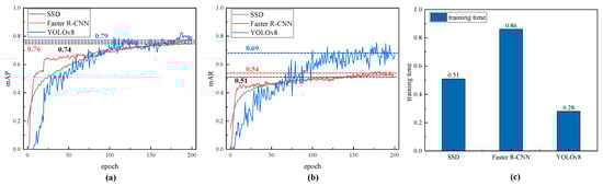 Furthermore, by considering detection accuracy, missed detections, and training time, the performance of three target detection models for rail damage is compared, as illustrated in Figure 8. Regarding detection accuracy, the Faster R-CNN model converges first as the number of training rounds increases. The SSD model exhibits a steadily growing overall curve and gradually converges. Initially, the YOLO model demonstrates the lowest growth rate with a highly oscillatory curve; however, it still achieves convergence in subsequent stages. Among these models, the mAP values are as follows: Faster R-CNN at 0.76, SSD at 0.74, and YOLOv8 achieving the highest value of 0.79, indicating the superior overall detection capability of the YOLO model. In terms of missed detections, the mAR values are as follows: Faster R-CNN at 0.55, SSD at 0.49, and YOLOv8 at 0.69. These results confirm that YOLOv8 has fewer missed detections, consistent with its previously demonstrated application effectiveness. Concerning training time, the Faster R-CNN model requires 0.86 h, the SSD model requires 0.51 h, and the YOLO model has the shortest training time at 0.28 h.
