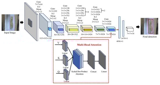 Although the YOLO model demonstrates superior detection performance compared to the Faster R-CNN and SSD models, its detection accuracy still requires further improvement due to its limited feature representation capabilities. Moreover, the MHSA module enhances the feature association of the detection model across different locations, effectively addressing the insufficient modeling capability of single-stage models within a finite feature subspace []. Consequently, this paper improves the YOLO model by integrating the MHSA module, as illustrated in Figure 9 []. The MHSA module is inserted between the convolutional layer and the fully connected layer with dimensions of 7 × 7 × 1024 because rich semantic and spatial features of rail damage are extracted after the preceding series of convolutional layers. Before entering the fully connected layer for classification and regression prediction, the MHSA module models the global relationships among features and integrates feature information from different regions. Within the MHSA module, queries, keys, and values generated by small blocks with positional encoding undergo linear transformations, producing multiple sets of submatrices []. These submatrices are then fed into multiple parallel scaled dot-product attention modules, and the outputs of each module are concatenated and linearly transformed to generate the final output. Additionally, the MHSA-YOLO model replaces the C3 module in the backbone with the C2f module to embed the MHSA module and adjusts the number of blocks from 3-6-9-3 to 3-6-6-3. In summary, the MHSA-YOLOv8 combines the object detection capabilities of the YOLO model with the global feature extraction advantages of the MHSA module, significantly enhancing the detection performance of rail damage in complex environments.