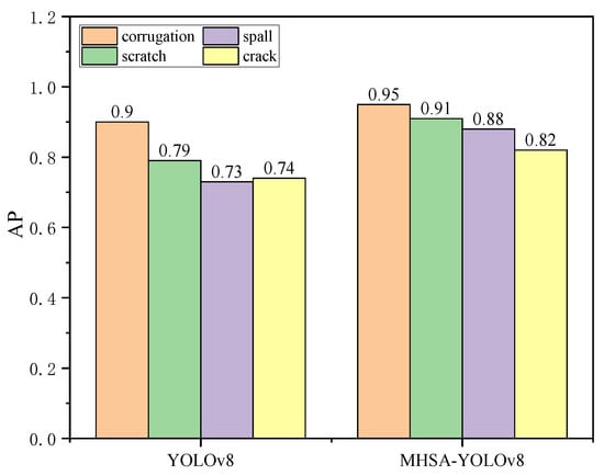 In this section, a detailed comparison is made between the YOLO model and the MHSA-YOLO model in terms of detection accuracy, missed detections, and training time. First, regarding detection accuracy, the performance of the YOLO and MHSA-YOLO models on four typical types of rail damage, including rail corrugation, is compared, as illustrated in Figure 10. It can be observed that the MHSA-YOLO model outperforms the YOLO model in detection accuracy. Specifically, both models demonstrate the highest accuracy for detecting rail corrugation, achieving accuracies of 0.9 and 0.95, respectively. For rail scratch detection, the MHSA-YOLO model improves accuracy by 11%, reaching 0.91. In the case of rail spall detection, the MHSA-YOLOv8 model achieves an accuracy of 0.88, which is 15% higher than the YOLOv8 model’s accuracy. Lastly, for rail crack detection, the MHSA-YOLOv8 model attains an accuracy of 0.82, representing an 8% improvement over the YOLOv8 model.