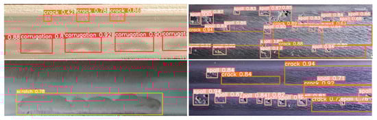In addition, Figure 11 illustrates the actual detection performance of the optimized MHSA-YOLOv8 model on four typical types of rail damage. Specifically, for rail corrugation detection, the MHSA-YOLOv8 model demonstrates superior accuracy compared to the YOLOv8 model, achieving an accuracy rate of 92%. Regarding rail scratch detection, the MHSA-YOLOv8 model exhibits enhanced precision, with an accuracy rate of 78%, which is notably higher than that of the YOLOv8 model. For rail spall detection, the MHSA-YOLOv8 model achieves a significant improvement in accuracy, increasing the overall detection accuracy by approximately 10% compared to the YOLOv8 model. Lastly, in terms of rail crack detection, the MHSA-YOLOv8 model outperforms the YOLOv8 model substantially, attaining an overall accuracy rate of approximately 90%.