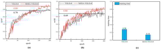 Furthermore, the detection accuracy, missed detection rate, and training time of the YOLO model before and after optimization were comprehensively compared, as shown in Figure 12. In Figure 12a, there is little difference between the YOLO model and the MHSA-YOLO model in the early stages of training. However, during the later convergence stage, the MHSA-YOLO model demonstrates significantly higher performance than the YOLO model. Specifically, the mAP reaches 0.89, which is 10% higher than that of the YOLO model. In Figure 12b, the mAR of the MHSA-YOLO model remains consistently higher than that of the YOLO model throughout the entire training process, indicating a substantial improvement in reducing missed detections for the optimized model. Additionally, regarding training time, as illustrated in Figure 12c, the MHSA-YOLO model requires only 0.14 h for training, which is 50% less than the training time required by the YOLOv8 model.