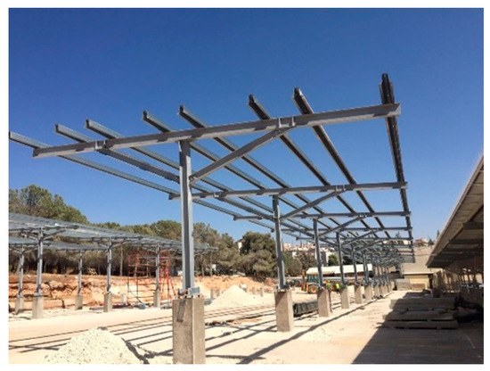 Steel-reinforced concrete anchors in solar-mounted structure.