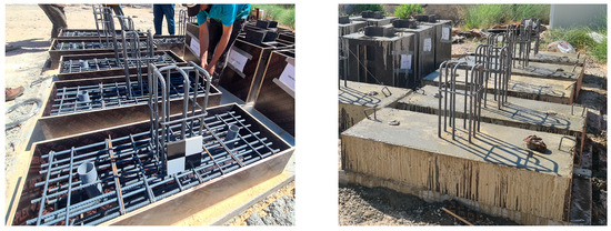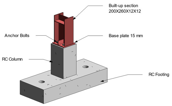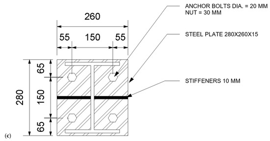 The steel section has a depth of 260 mm, with top and bottom flanges measuring 200 mm in width and 12 mm in thickness. The web thickness is 12 mm. The steel section was affixed to the RC column by using 15 mm thick steel base plate, with the steel base plate measuring 200 square millimeters and the steel plate measuring 260 mm by 260 mm. Four ϕ20 mm anchor bolts were placed at the corners, with edge distances to the center of the bolt measuring 55 mm on the direction of loading and 65 mm on the other side. All the bolts are 20 mm in diameter with embedment depth of 160 mm. The distance between the anchor bolts is 150 mm center-to-center in both directions. Figure 3c shows the dimensions and detailing anchorage, which are typical in all specimens. The sequence of the construction of specimens is shown in Figure 4.