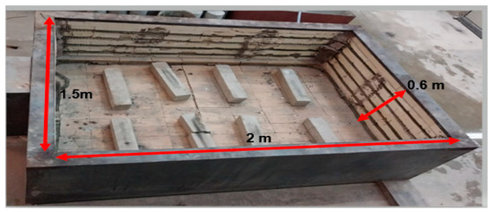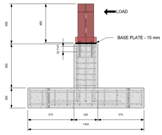 The RC footing has a rectangular shape, with dimensions of 580 mm (width) by 1450 mm (length, in direction of loading) and 250 mm in thickness. The footing is reinforced with top and bottom longitudinal reinforcement of eight bars ϕ16 mm and transversely reinforced with ϕ16 hoops spaced at 125 mm on center. The RC column was centered within the footing for all specimens, with their embedded reinforcement extending into the footing and forming a 90-degree hook.