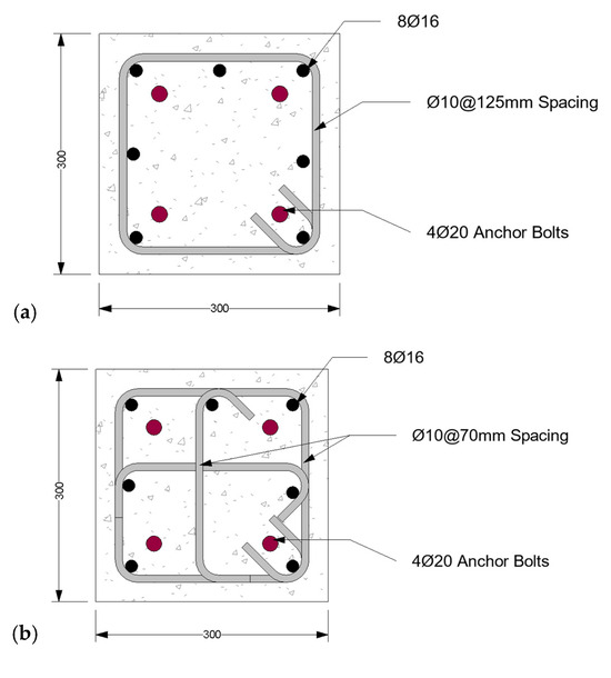 All of the specimens were comprised of reinforced concrete (RC) footings and RC columns supporting structural steel columns, which exhibited identical dimensions and geometry across all specimens. The specimens’ details are presented in Table 1 and shown in Figure 2. The RC columns were designed as SMF or IMF based on ANSI/AISC 360-22 [15], and the reinforcement details are presented in Figure 3a,b. Across all groups, the footings and structural steel columns were consistently detailed.