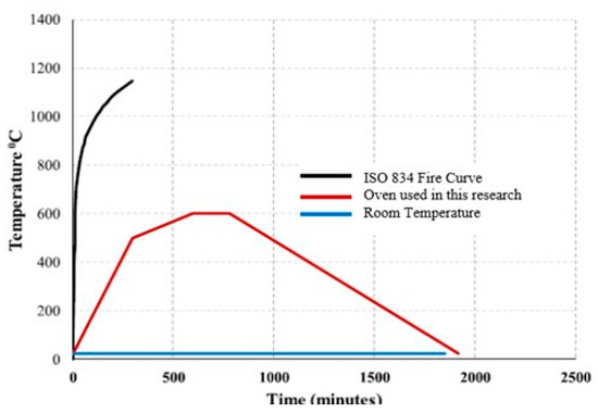 An oven with external dimensions of 2 m × 1.5 m × 0.6 m, as shown in Figure 5, was used to expose the structure to a high temperature of 600 °C. The temperature and heating time were controlled by an electronic panel beside the electric furnace. After reaching 600 °C, the temperature was kept constant for three hours. The temperature history implemented in this study is displayed in Figure 6.