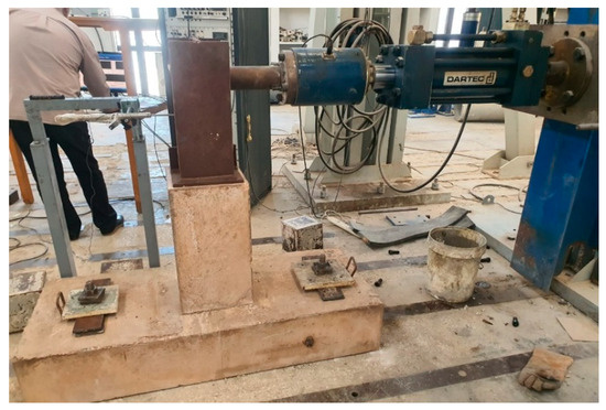 All specimens were subjected to static monotonic lateral load until failure (Figure 7). For specimens strengthened with CFRP, the installation of the CFRP sheets was carried out after the cooling phase of the fire exposure. Then, the specimen was loaded to failure. The breakout failure mode of the four bolts anchor group was investigated. The anchors were loaded perpendicular to and towards the free edge before and after fire exposure.