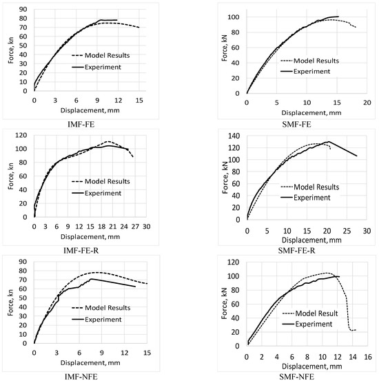 The summary of the numerical results for the load–displacement relationships of tested specimens are presented in Figure 8. It can be concluded that the numerical results capture the experimental outcomes well and could trace the response up to and beyond failure.