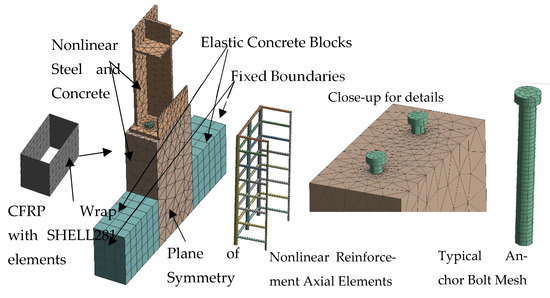 The experiments were modeled using ANSYS software 2023 [16]. High-fidelity three-dimensional finite-element models were constructed using many types of elements and incorporating mechanical and the thermal temperature-dependent nonlinear properties of the materials. Figure 9 shows the general mesh details of the FE model for one of the tests. The structural steel, anchor rods, and the concrete were modeled using coupled-field SOLID226 elements with 20 nodes per element. SOLID226 element allows the capture and interaction of both stress and temperature fields within the solids due to its thermal–structural coupling. The steel reinforcements were explicitly embedded inside the concrete elements using finite-strain 1D LINK180 axial elements that are perfectly bonded to concrete. The interfaces between concrete and the structural steel section as well as between steel plates and the head of the anchor bolts were modeled as frictional interfaces with Columb coefficient of static friction = 0.3, which was adopted from Xu et al. [17]. The CFRP wraps were modeled using the 8-noded SHELL281 elements. The bond between the concrete and the CFRP was assumed to be perfect. However, the interface between anchor rods and concrete was assumed to be cohesive and was thus modeled using cohesive zone elements and materials, as explained later.