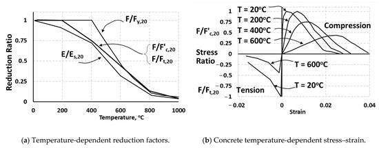 Mechanical properties as a function of temperature, (a) strength and stiffness reduction factors for steel and concrete, and (b) the normalized temperature-dependent stress–strain curves for normal concrete.