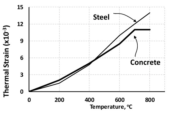 The input temperature-dependent mechanical material properties that were used in the simulations are shown in Figure 10 and Figure 11 and were adopted from Kodur et al. [18]. The normalized stress–strain curves for both concrete and the reduction factors for steel and concrete are shown in Figure 10. The steel is assumed to follow a perfectly elastic–plastic stress–strain curve with temperature reduction factors for both yielding and elastic moduli, as shown in Figure 10a. The concrete is assumed to follow nonlinear stress–strain curves, as shown in Figure 10b, with the temperature degradation ratio of its compressive and tensile strengths shown in Figure 10a. For the thermal analysis, the temperature-dependent variation of the thermal strain for both steel and concrete is considered and shown in Figure 11. The thermal strain is an important factor in the coupled thermal–mechanical analysis because it produces the heat-induced thermal strain and stresses inside the specimens due to heating and cooling. Thermal analysis is presented in the subsequent section.