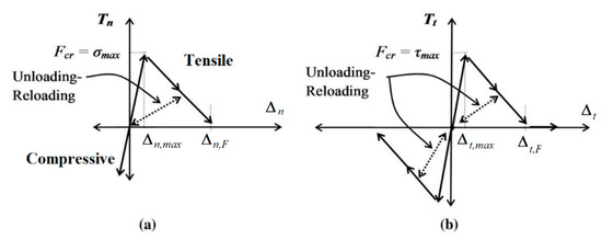 where Gn and Gt are the fracture energies due to pure normal and pure shear tractions, respectively. The Gn,cr and Gt,cr are the critical fracture energies that cause complete debonding in either normal or shear mode, respectively. The fracture energy up to a slip “x” is defined as