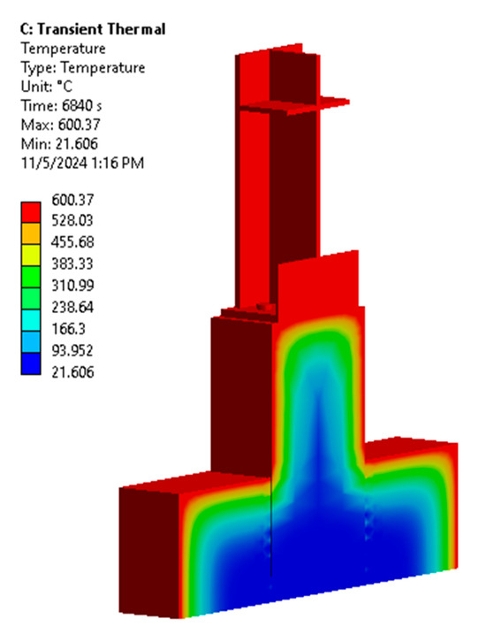 Cross-sectional temperature distribution (°C) from the thermal analysis after 3 h in the furnace.