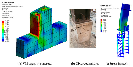 Comparing results for the specimen IMF-FE and (a) von-Mises equivalent stresses at time of failure, where the crushing is shown to happen near the compressed region; (b) the observed failure pattern; and (c) stresses in the steel, anchor bolts, and reinforcement. While the anchor rods and structural steel reached the yielding point, the reinforcement remained elastic.