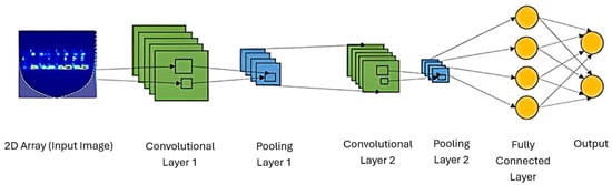 Convolutional neural networks (CNNs) are highly effective for extracting features from structured data. For SHM applications, 1D CNNs process sequential data, such as strain or vibration signals, while 2D CNNs are better suited for analyzing time-frequency representations, such as spectrograms. One-dimensional CNNs excel at capturing local patterns in time-series data, offering computational efficiency and simplicity. However, they may struggle with complex spatial relationships and noisy data. Conversely, 2D CNNs are ideal for detecting spatial patterns and analyzing transformed signal data but require higher computational resources and larger datasets to perform effectively. The selection of CNN type depends on the nature of the input data and the desired analysis outcomes [,,,,]. Figure 1 below shows the typical architecture of a CNN. This particular example is a 2D CNN as evident from the image input on the left. The input image is a scalogram generated using the CWT, where the color scale ranges from blue to red, with red representing areas of highest signal intensity.