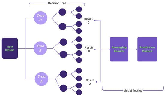 Decision trees offer a simple and intuitive approach to data classification and regression. Their hierarchical structure enables clear decision-making, making them easy to interpret and implement. In SHM applications, decision trees can quickly classify damage types or load levels based on sensor data with minimal preprocessing []. However, they are prone to overfitting, especially when dealing with small or noisy datasets, and may fail to capture the complex relationships among features. Figure 3 shows the architecture of a Random Forest classifier. It operates by constructing multiple decision trees during training. Each tree is built using a random subset of the training data and features, which helps to reduce overfitting and improve generalization. The final classification is determined through a majority voting scheme across all individual trees.