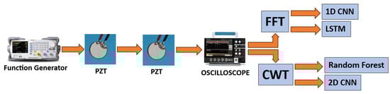 The response signals were captured using a piezoelectric transducer (PZT) positioned on the beam’s surface. Data acquisition was performed with a Tektronix 2 Series oscilloscope, ensuring the high-resolution capture of the received signals. Figure 6 provides an illustration of the testing configurations employed.