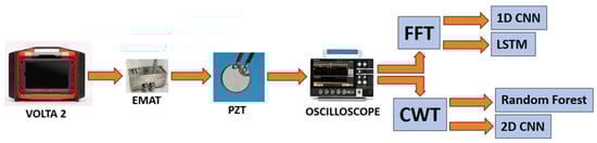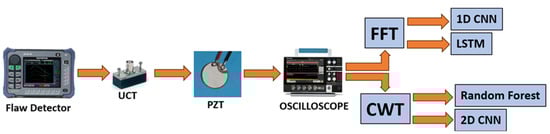 In this study, a hybrid SHM-NDT system was developed and tested on an I-beam subjected to variable loads to demonstrate its broader applicability []. Excitation signals were generated using both NDT and SHM equipment and were captured by standard SHM sensors [,]. The acquired signals were processed using frequency- and time-frequency domain techniques such as the fast Fourier transform (FFT) and continuous wavelet transform (CWT), and subsequently analyzed using artificial intelligence-based classification models [,]. This multifaceted approach highlights the potential of hybrid SHM-NDT systems to deliver robust, accurate, and scalable structural assessment solutions across a range of engineering applications.