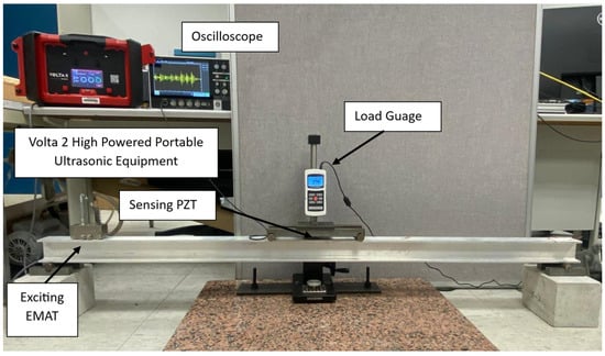 - EMAT probe excitation–PZT monitoring: Volta 2, a high-powered portable ultrasonic instrument, was used in conjunction with an EMAT probe to excite Point A and Point B on the beam at a frequency of 1150 kHz. The data were collected at a sampling frequency of 2.5 GS/s.