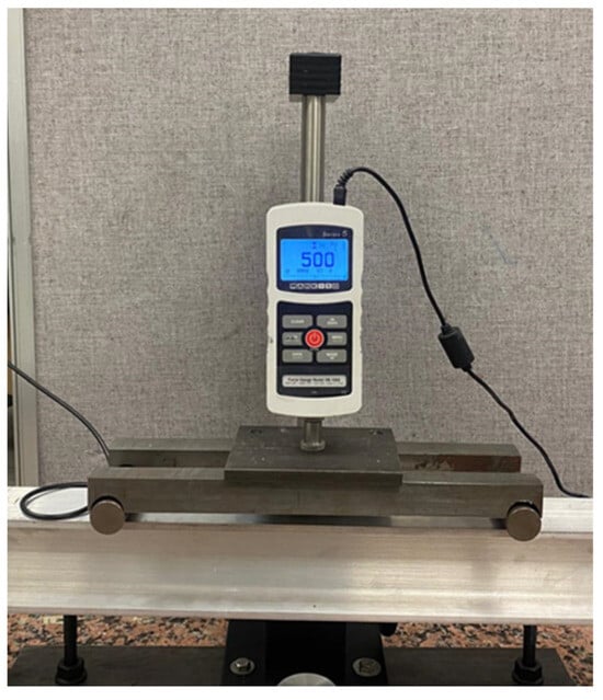 Static loads of 500 N and 1000 N were applied to the beam using a Mark-10 Model M5-1000 load gauge in the four-point bending test setup shown in Figure 8 and Figure 9. The PZT sensor was placed on both the top (same side as the load application where the beam is under compression) and bottom surfaces of the beam (where it is under tension), along with measurements at two points—Point A at the end of the beam and Point B is 1.5” from the midpoint—to measure variations in signal responses under different loading scenarios. Baseline readings were recorded without any applied load to establish reference data for comparative analysis.