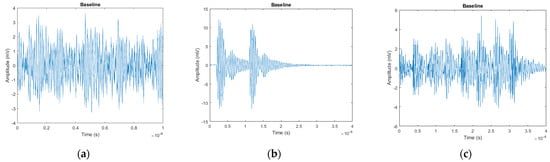 Time series (V vs. time) plots from signal data received by oscilloscope. (a) PZT-PZT time series signal; (b) UCT-PZT time series signal; (c) EMAT-PZT time series signal.