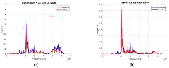 The FFT plots for the baseline and when 1000 N was applied when (a) the probes were placed on the side of the beam experiencing compression (top side); (b) the probes were placed on the side of the beam experiencing tension (bottom side).
