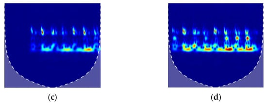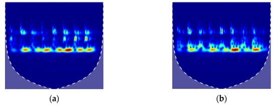 One of CWT’s distinguishing characteristics is its adaptability in window size relative to the frequency of interest. For higher frequencies, shorter windows provide finer temporal resolution, though at the expense of frequency precision. Conversely, longer windows at lower frequencies yield improved frequency resolution while sacrificing time specificity. These properties make the CWT particularly effective for analyzing non-stationary signals, where frequency content varies over time [,,]. This capability positions the CWT as a valuable tool for applications like SHM, where accurate time-frequency analysis is crucial for identifying and assessing surface wave propagation behaviors to identify potential damage mechanisms.