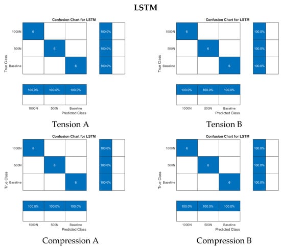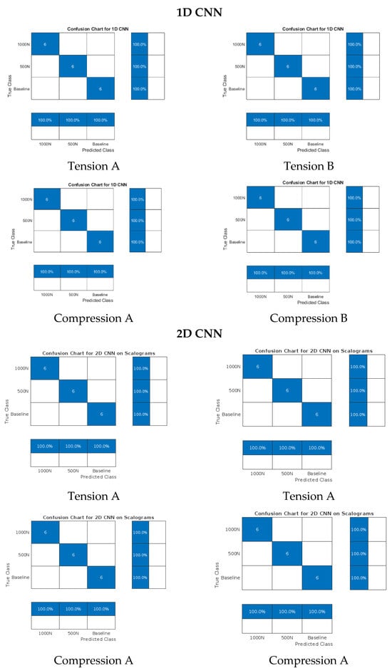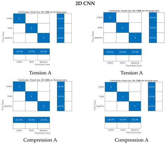 All the models were trained (FFT for 1D CNN; CWT for 2D CNN) with 4 cases per category (12 in total). After the training, a total of 18 test cases (which were not used in training) were classified with the models. The confusion matrices of the test cases are presented in Figure 13. The similar training and test routine was used for FFT-LSTM and CWT–random forest combination. Confusion matrices are presented in Figure 14, where correct classifications, shown in blue, appear along the diagonal of each chart. The information presented by the confusion matrices is outlined in Table 2.