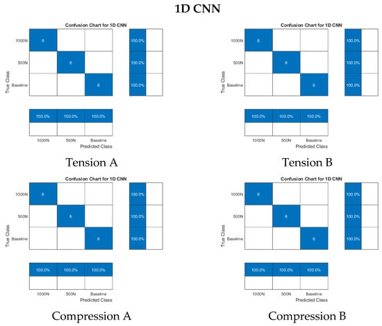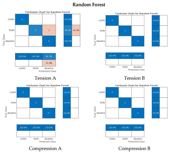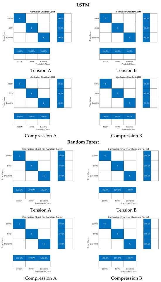 The training and test procedure of the PZT-PZT case outlined in Section 4.1 was used. In the case of the UCT-to-PZT setup, the results displayed in Figure 15 and Figure 16, were similarly impressive, with most tests achieving 100% classification accuracy. However, a single misclassification was observed in the random forest model for data collected at Point A on the tension side, as shown in Table 3. This anomaly, involving one misclassified dataset out of 18, is likely attributable to an outlier in the data. While this result demonstrates the robustness of the UCT-to-PZT setup, it also highlights the importance of addressing data anomalies through preprocessing or algorithm refinement to maintain high accuracy.