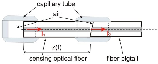With its end faces perpendicular to the fiber axis and surrounded by air, the sensing optical fiber reflects approximately 4 percent of the incident optical radiation. This configuration allows the fiber to operate as a low-finesse Fabry–Perot interferometer. For an interferometer functioning in the optical fiber’s single-mode regime, the monochromatic optical signal in the time domain, arising from the interference of the two beams reflected from the fiber ends, can be expressed as